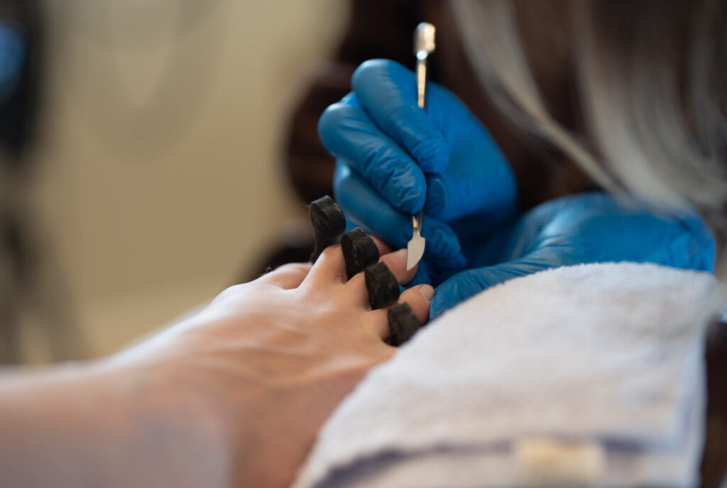 Élimination des cellules mortes, gommage, callosités + soin des cuticules. Sans vernis.
